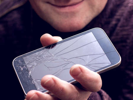 A man holds a mobile phone with a broken glass in his hand and smiles