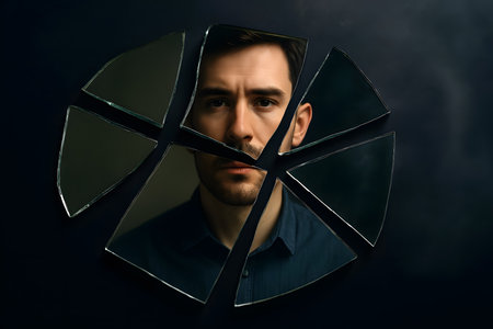 Young girl with long ginger hair looking at broken mirror with blank expression