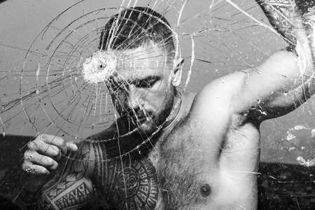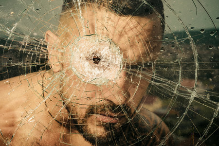 brain destruction. crush test. theft. emotional discharge. anger. destruction. sexy hispanic man broken mirror. bullet hole in glass. broken glass because of hit. macho man behind crushed glass