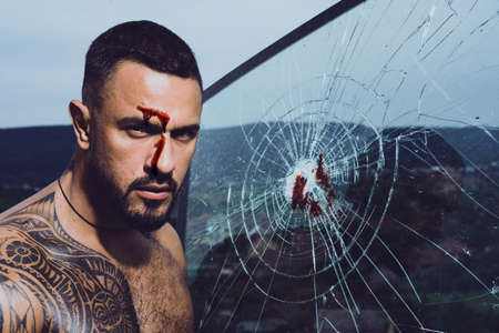 Confident attractive man with serious face. Gangster man. Dangerous criminal, hooligan guy on cracked bullet glass.