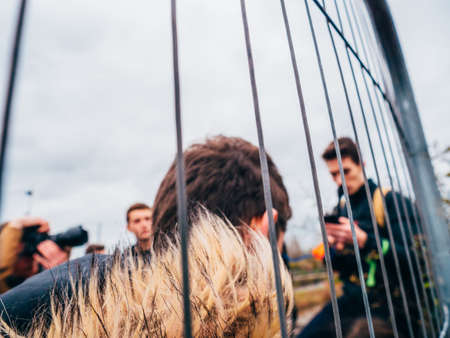 STRASBOURG, FRANCE - MAR 15, 2019: Young boy addressing to crowd near European Parliament during demonstrations against climate change global movement Fridays for Future - photo done through protecting fence