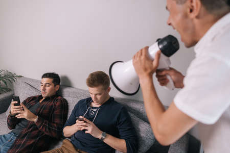 Two bullies threatening teenager boy and girl filming on phone. Cyber bullying and violence concept.