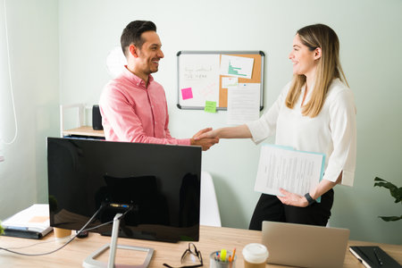 Business partners shaking hands and smiling after closing a deal with a client. Caucasian woman and hispanic man working at the office