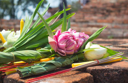 A sacrifice worship to Buddha with Lotus and candle light on plastic plate