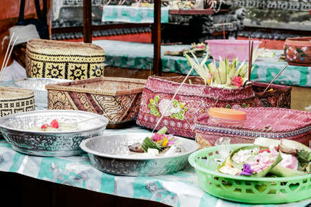 Hindu offerings and gifts to god in the temple in Bali, Indonesia