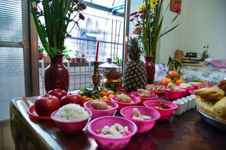 Chinese Gods such as Bodhisattva and Dhritarastra are worshipped with fruits and other decorations in Chinese New Year