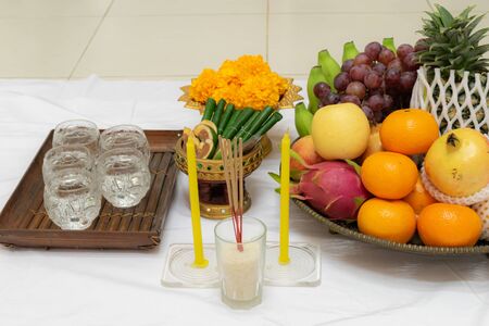 The offering incense sticks, candles and fruits prepared to worship.