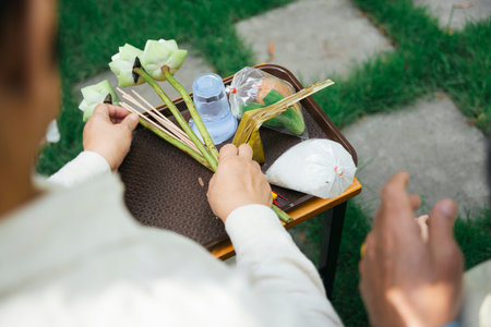 A priest arranging the decoration of worship ritual of hindu god and goddess in a sacred temple in Bali, Indonesia