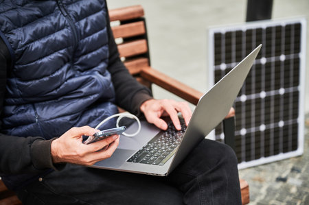 Cropped view of man sits on wooden bench, working on laptop and smartphone, both connected to solar panel. Urban setting and casual attire highlight modern, sustainable, mobile workspace.