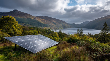 A solar panel array installed on a mountainous terrain with a serene lake and forest landscape in the background.