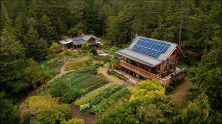 A modern homestead features solar panels atop a wooden house surrounded by lush gardens and greenery. Paths wind through bountiful vegetable plots in a serene forest setting.