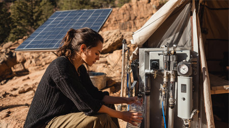 Young Caucasian woman repairs solar panel and water filtration system inside a rustic tent. Daylight adds cozy, independent off-grid atmosphere.