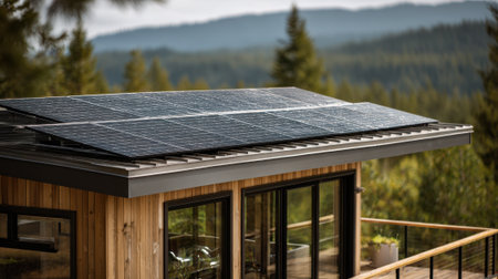 Medium shot of a modern offgrid manufactured home rooftop with solar panels sharply in focus showcasing sustainable energy design while the surrounding landscape softly blurs.