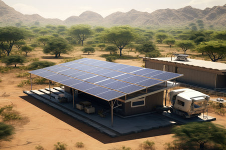 Sustainable energy setup with solar panels and a wind turbine in a green field under a clear blue sky