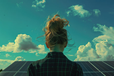 A woman with windswept hair stands before a field of solar panels, gazing towards the vibrant blue sky filled with puffy white clouds.