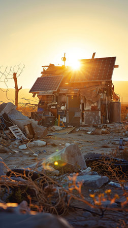 Thing, makeshift shelter, solar panels, repurposed technology, in a barren wasteland, photography, golden hour, lens flare, Tilted angle vie