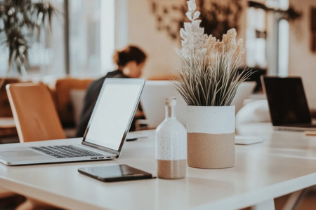 comfortable office with open blank screen laptop computer with mock up frame and office supplies with decorations