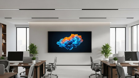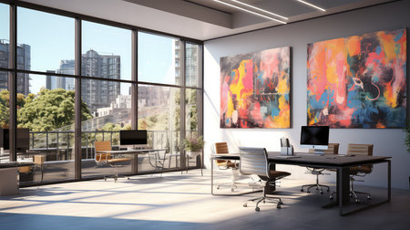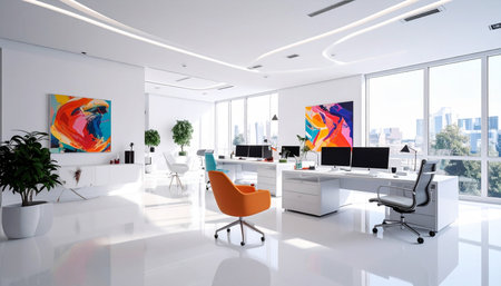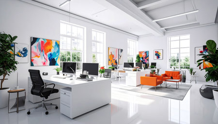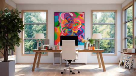Discover a vibrant and colorful modern office that promotes creativity and collaboration. Featuring ergonomic desks, dynamic artwork, and lush plants for inspiration.