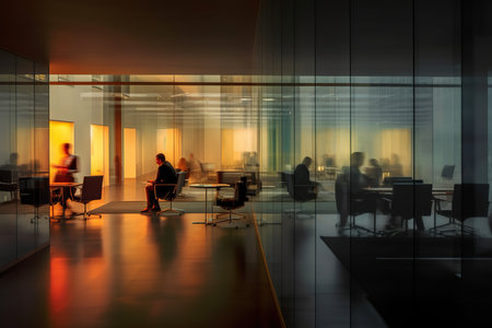 office building exterior looking through window business person meeting working late at night in meeting room with Generative AI technology