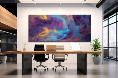 An office with a large table and chairs and a large colorful abstract painted artwork on wall. Modern office space for a businessman, laconic and modern style. Creative business environment concept