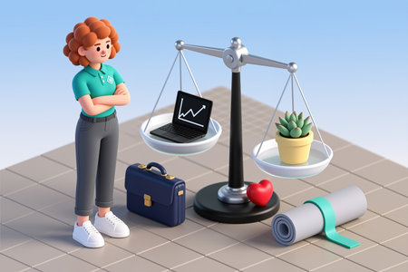 Standing confidently beside a balance scale, a woman weighs her professional and personal life, symbolizing the quest for harmony between work and leisure activities.