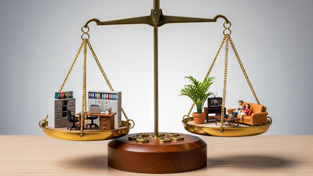 A conceptual image presents work and life on scales, each holding miniature office and home scenes. The composition uses warm lighting and a neutral background. The detailed elements include furniture and plants. This visual is suitable for illustrating themes such as balance, choices, and lifestyle topics for various applications.