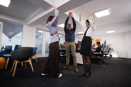 Successful business people group celebrating project success at office. Team winner and collaboration achievement concept.