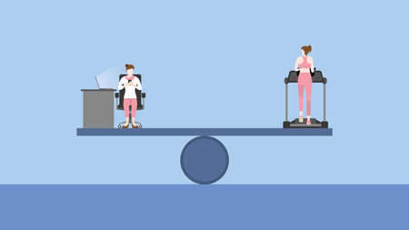 Work-life balance concept between a female employee works on a laptop computer at the office desk and a man running on a treadmill. The balanced lifestyle of health care and work hard on a seesaw.