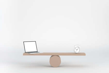 3D. Business management concept. laptop and clock on wooden seesaw balancing on white background