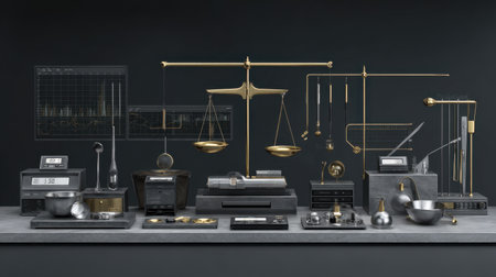 A contemporary laboratory setup showcasing a range of precision instruments, including scales and measuring tools, emphasizing a sleek design and modern aesthetics.