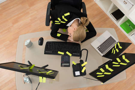 Tired Young Businesswoman With Reminder Notes Sleeping On Desk In Office