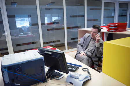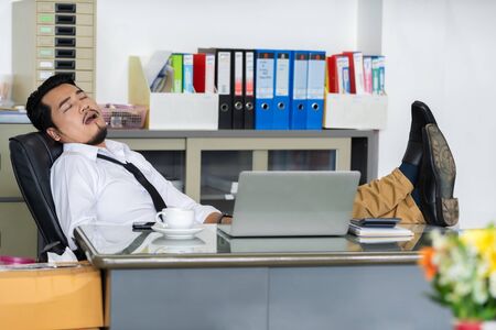 Tired businessman sitting in the office and working on laptop. Businessman sleep and making successful business.