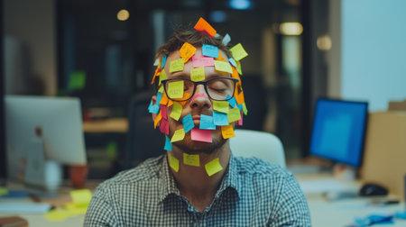 Frustrated young man in formal wear sitting in an office with sticky notes on his face, reflecting stress and creativity.