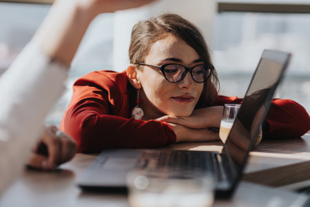 A portrait of a designer working at home on new ideas. a dark-haired woman sits at a white table in black strict clothes, looks into a webcam on a laptop.