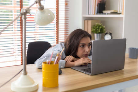 Exhausted caucasian businesswoman lay down on the table while work hard at home office. woman tired of work and not inspiration, lazy apathetic. Girl tired of learning sit at home looking at laptop