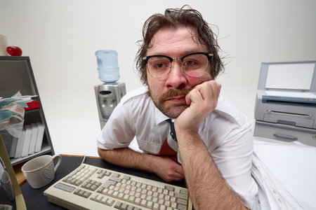 Frustrated office worker leans on desk, looks tired, surrounded by retro tech and paperwork, showing burnout and lack of motivation