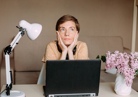 Photo of exhausted office woman sitting in front of a computer laptop at the modern working desk.