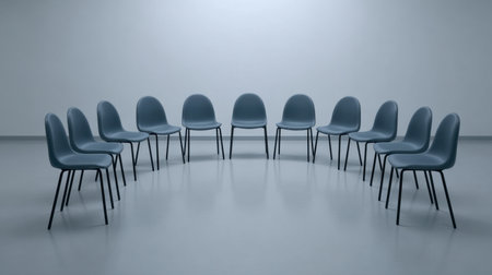 A minimalist setting featuring a circular arrangement of modern gray chairs in an empty room, perfect for meetings or discussions. The design promotes simplicity and tranquility.