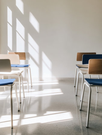 Modern Minimalist Classroom Chairs Sunlight Interior Design blue wood home calm white metal clean