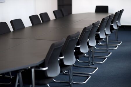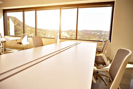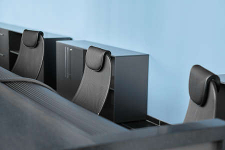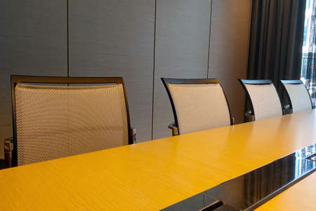 Meeting room interior. Modern office with table for conference and empty chairs. Workplace in business corporation