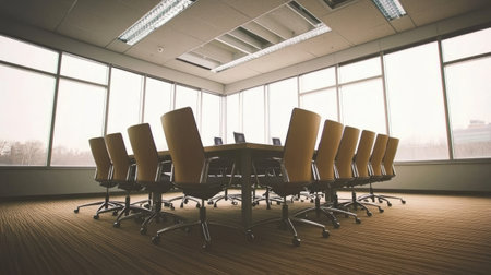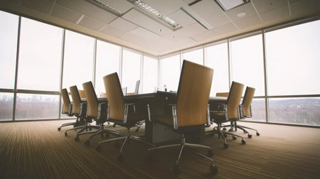 A modern conference room featuring large windows, wooden chairs, and a sleek table. This professional workspace is ideal for meetings and collaboration.