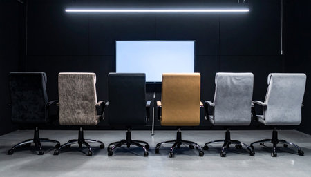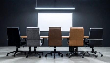 A row of diverse, empty chairs sits in a dark, modern conference room, waiting for the next big meeting.