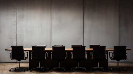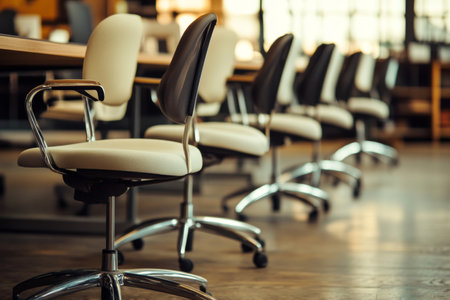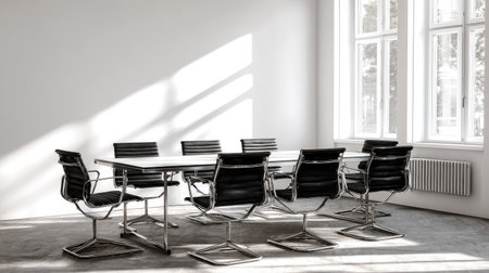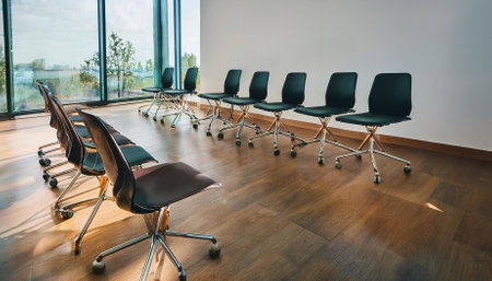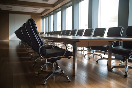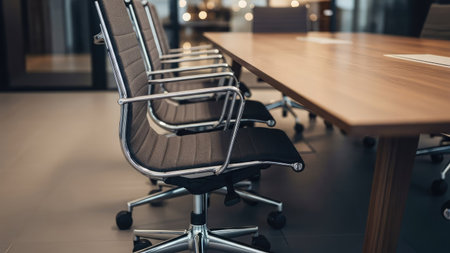 An interior shot features a row of chairs placed near a large wooden table. The chairs have black upholstery and chrome frames, the setting is in a well-lit space. The composition suggests a setting for business meetings or presentations, suitable for editorial or commercial applications.