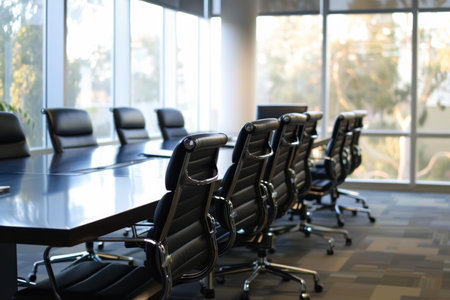 This image showcases a line of sleek black leather chairs around a modern conference table, set in a professional meeting room. Ideal for business-related imagery.