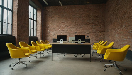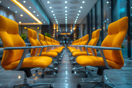 Modern office meeting room featuring rows of vibrant yellow ergonomic chairs aligned along a polished table. the sleek, contemporary design showcases a well-lit, professional space ideal for business conferences, corporate gatherings, and productive meetings.