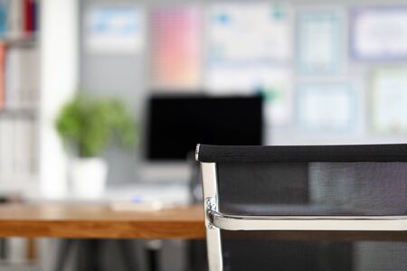 Close-up of chief executive manager office with black armchair, flowers, computer monitor,certificates and other interior items. Corporation and business concept
