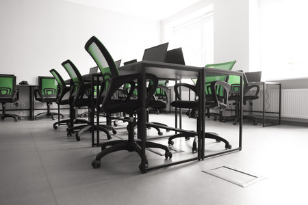 An office interior displays desks with laptops and chairs, suggesting a workspace environment. The composition features a neutral color palette with hints of blue. The arrangement offers a view of desks, chairs, and other office equipment, suitable for commercial projects or editorial purposes. The shot benefits from overhead lighting.
