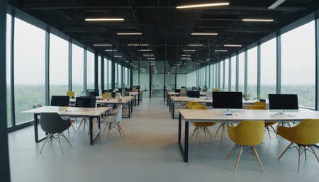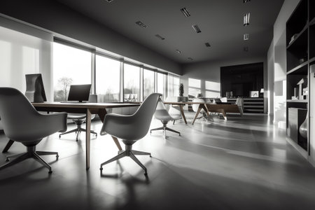 Modern office space with ergonomic chairs and minimalist desks, capturing the essence of a productive yet calm environment. Perfect for workplace imagery.