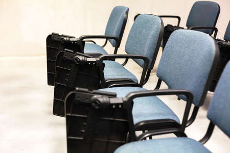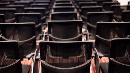 Empty university lecture hall chairs closeup no students present, empty university classroom, auditorium Lockdown, covid 19 quarantine, closed educational facilities, class dissmissed abstract concept