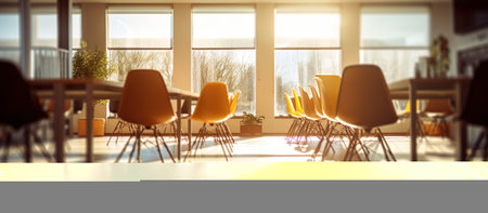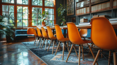 Trendy interior decor with multi-colored plastic chairs and tables, focusing on functionality and style. AI generated.